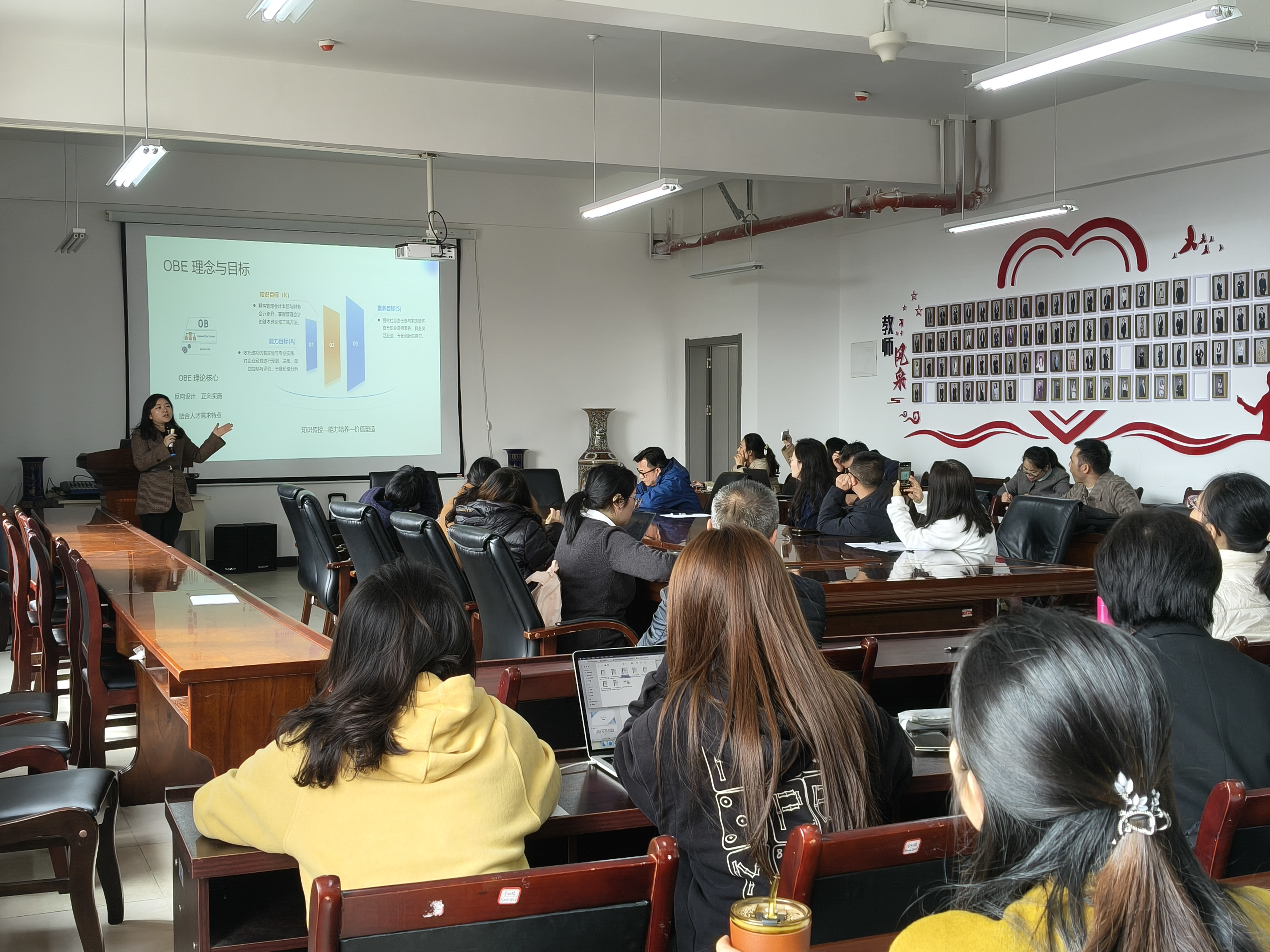 讲座中,周教授首先明确课程核心逻辑,以OBE理念为指引完成课程定位与目标重构,从能力目标、知识目标、素养目标三个方向着手,结合人才需求特点,通过方向设计、正向实施,形成“知识传授—能力培养—价值塑造”的人才培养模式,促进学生的全面发展。